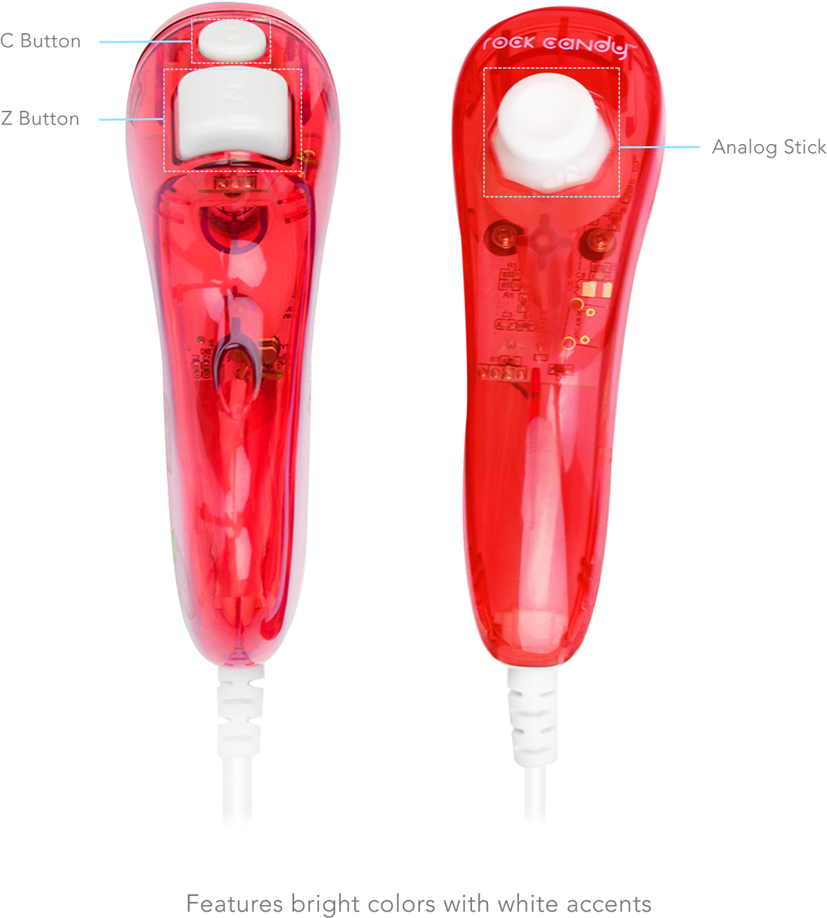 64 2364 23. The Rock Candy Control Stick for the Wii comes in assorted tinted and transparent colors including Blue Green Orange Pink Red Purple and Yellow. The Rock Candy Wii Control Stick line works with any Wii Remote and Wii U consoles.